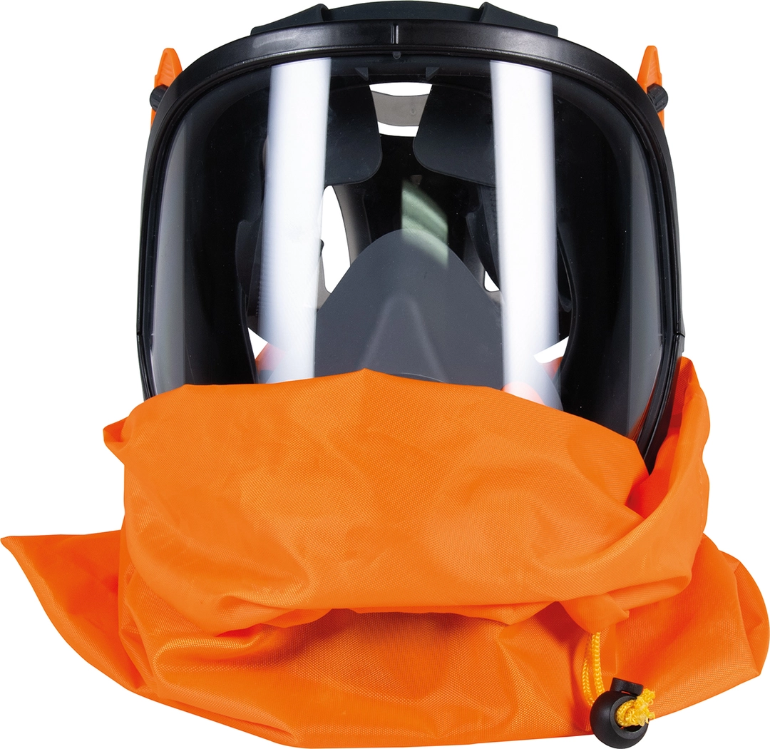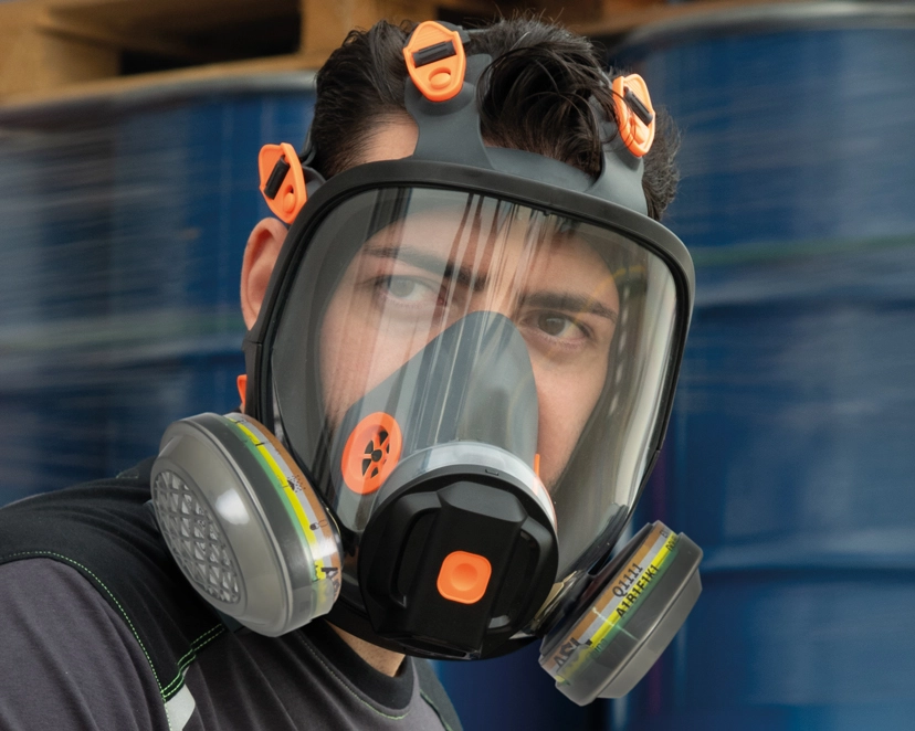 • La máscara está equipada con una válvula de exhalación central capaz de disipar fácilmente el calor y la humedad y aumentar el confort; el aire exhalado, gracias a la construcción de la carcasa dura exterior, se dirige hacia abajo para no interferir con el posible uso combinado de otros EPI.