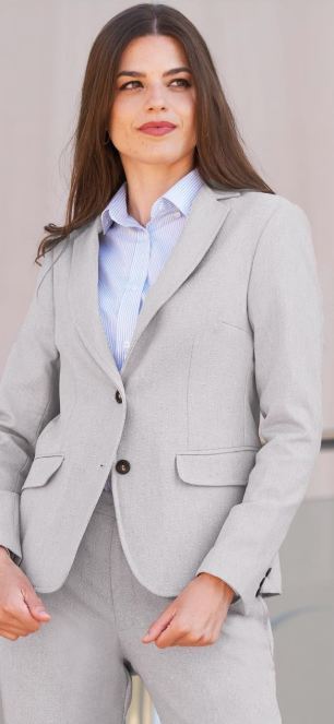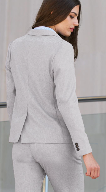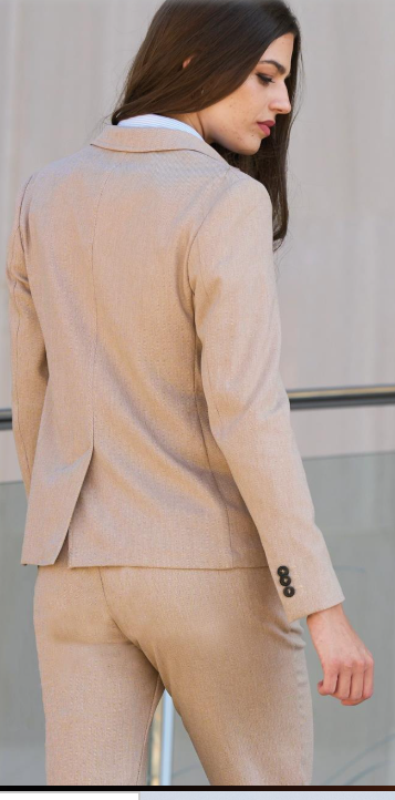 -Solapa recta -Sin forro -Dos botones bajos -Una abertura -Entallada -Elástica -Dos bolsillos
