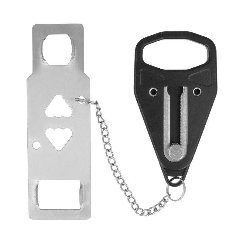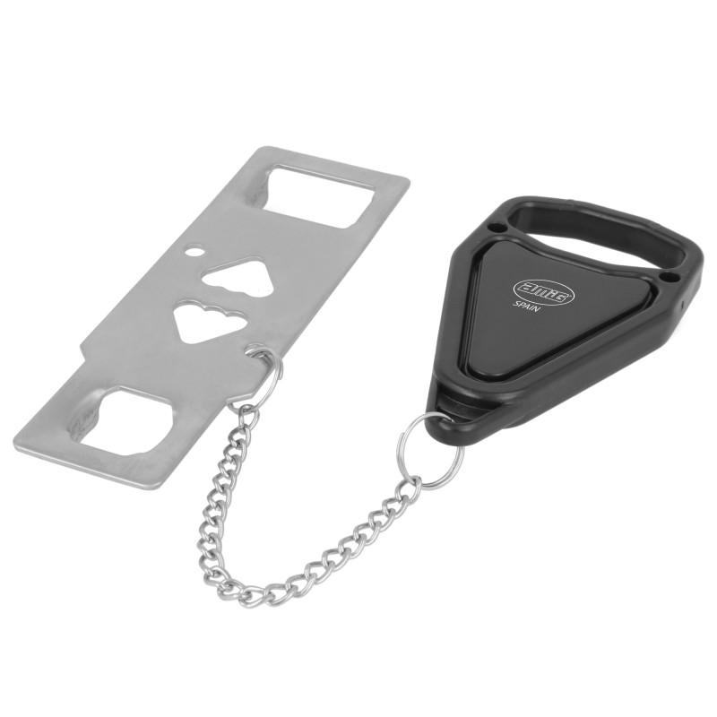 Bloqueo portátil para puertas que disponen de un picaporte para su cierre. Fabricado en acero inoxidable, con mecanismo en plástico de alta resistencia. Para puertas de apertura hacia el interior. Es fácil de instalar sin necesidad de herramientas y evita que la puerta se abra desde el exterior, proporcionando mayor privacidad y seguridad.