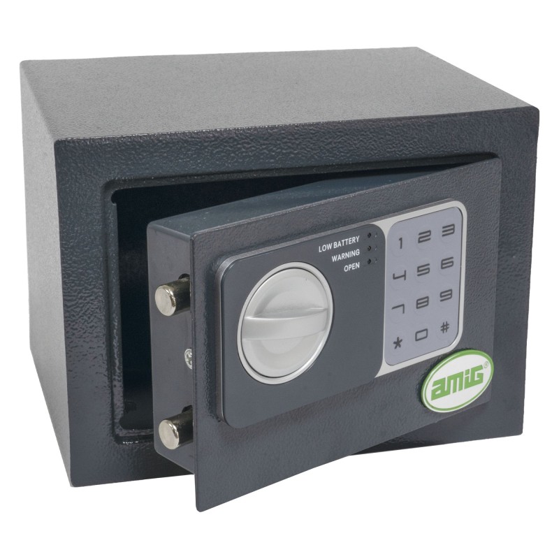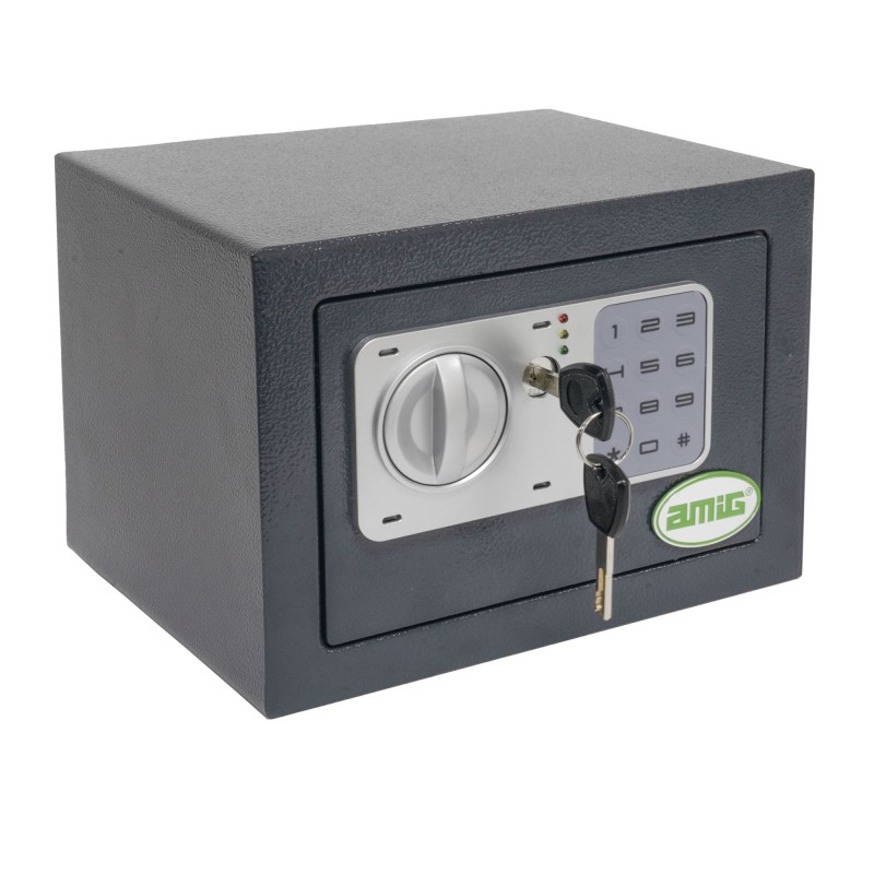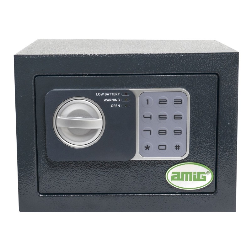 Caja fuerte de sobreponer fabricada en acero de alta calidad. Sistema de apertura eléctrico con accionamiento con pomo. Indicador luminoso (verde, amarillo y rojo). Botón de reseteado para cambio de código. Dos bulones de acero de Ø13,5 mm. Con agujeros para sufijación en la pared y accesorios de fijación a la pared. Incluye moqueta