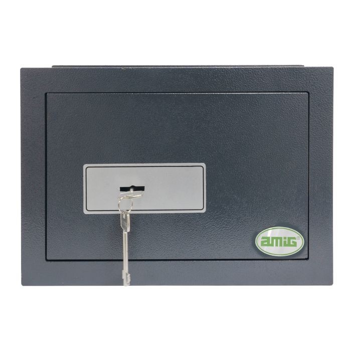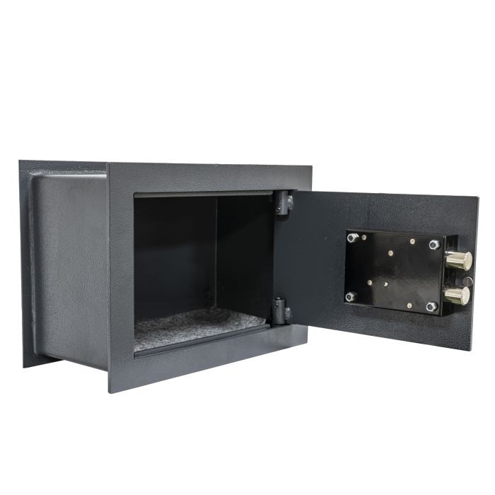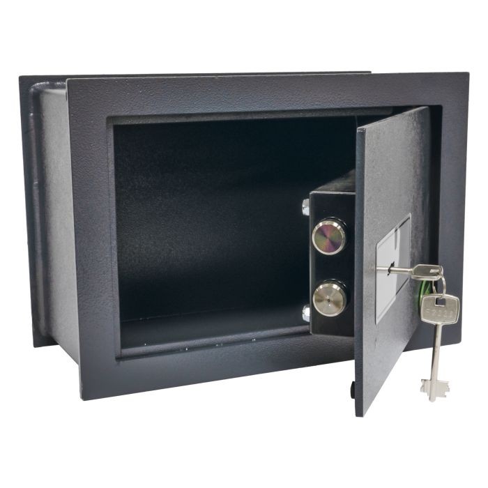Caja fuerte de embutir con apertura mecánica con llave de gorja. Incluye dos llaves. Dos bulones de acero de Ø20 mm. Con agujeros de fijación en la pared y accesorios de fijación. Incluye moqueta.