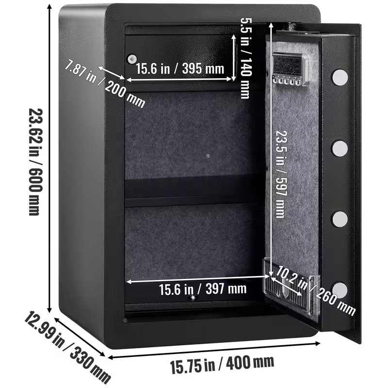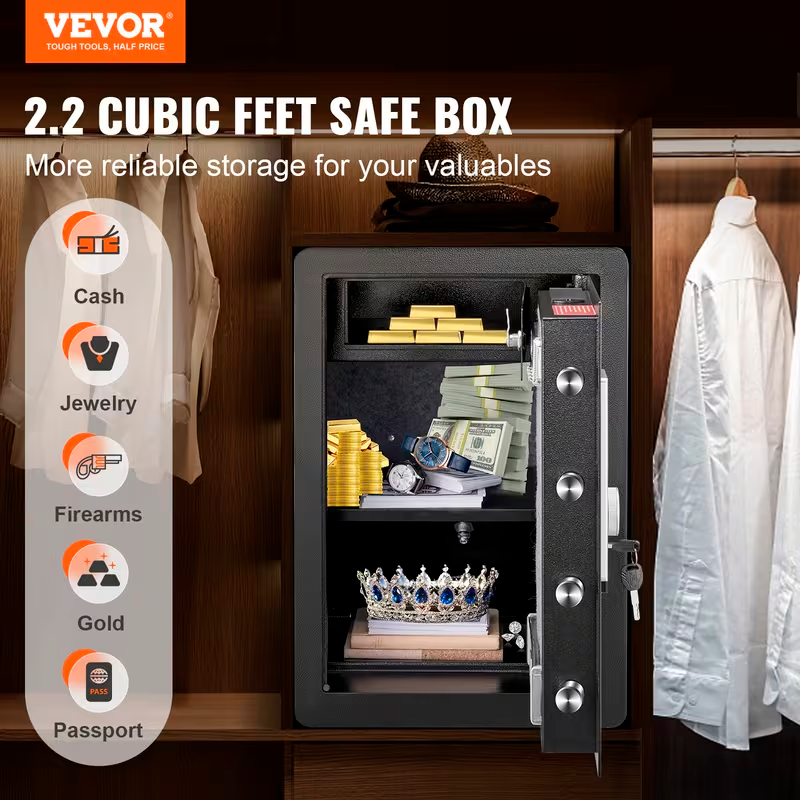 La caja fuerte VEVOR de 2.2 pies cúbicos ofrece una solución de seguridad avanzada para proteger tus pertenencias más valiosas en hogar, oficina o negocio. Fabricada en acero de aleación de alta resistencia, combina robustez, tecnología y gran capacidad de almacenamiento.