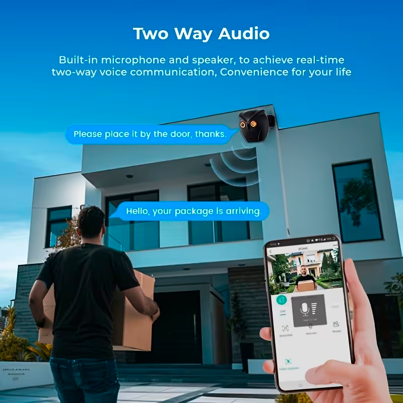 El audio bidireccional permite interactuar directamente con tu familia o tus mascotas, mientras que la visión nocturna garantiza vigilancia continua incluso durante la noche.