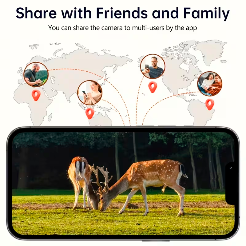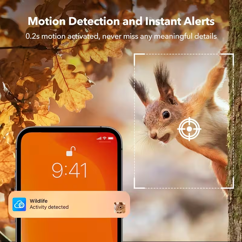 La cámara funciona mediante energía solar con batería recargable de 9000 mAh, proporcionando una solución de vigilancia autónoma ideal para zonas remotas sin acceso a electricidad. Además, admite almacenamiento en tarjeta microSD de hasta 512 GB o almacenamiento en la nube.