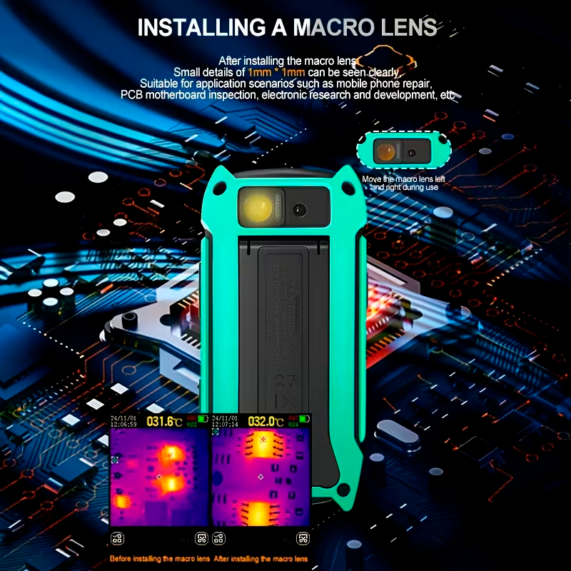 Equipada con pantalla LCD digital a color de 7,11 cm, esta cámara facilita la visualización de las mediciones térmicas en tiempo real, ofreciendo una experiencia de uso clara y cómoda durante las inspecciones. Además, incluye lente macro, ideal para analizar componentes pequeños como circuitos electrónicos, conexiones eléctricas o placas PCB, donde se requiere mayor nivel de detalle.
