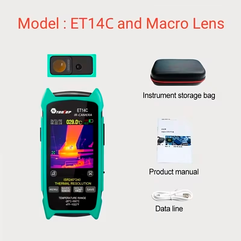 La cámara termográfica TOOLTOP ET14C+ ISR es una herramienta avanzada diseñada para inspecciones térmicas precisas en trabajos eléctricos, fontanería, HVAC y mantenimiento técnico. Gracias a su resolución infrarroja de 240 × 240, proporciona imágenes térmicas claras y detalladas que permiten identificar variaciones de temperatura con gran precisión.