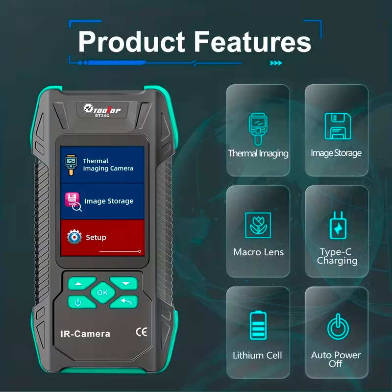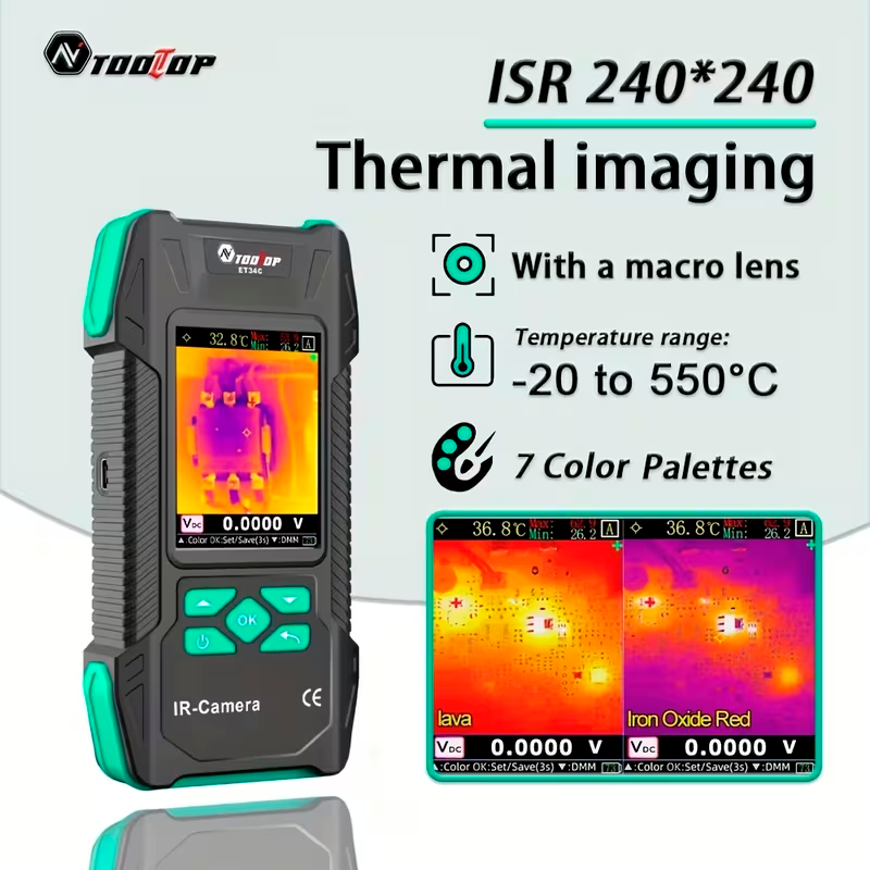 La cámara termográfica TOOLTOP ET34C ISR es una herramienta de diagnóstico térmico de alta precisión diseñada para inspecciones eléctricas, fontanería, mantenimiento técnico y análisis de circuitos electrónicos. Gracias a su resolución térmica de 240 × 240, ofrece imágenes detalladas que permiten identificar variaciones de temperatura y detectar problemas ocultos con mayor claridad.