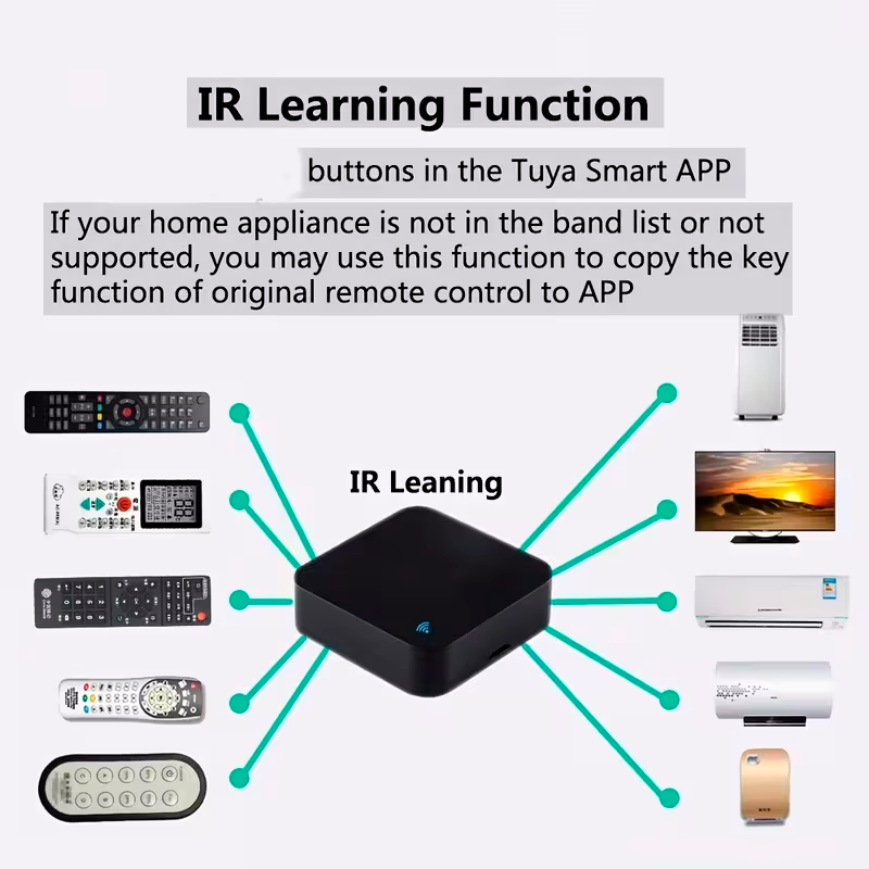 El control remoto inteligente Tuya WiFi infrarrojo (IR) es la solución perfecta para convertir tu hogar en un espacio totalmente automatizado y conectado. Este dispositivo permite controlar múltiples aparatos como televisores, aires acondicionados, DVD y otros dispositivos IR, todo desde tu móvil o mediante comandos de voz.