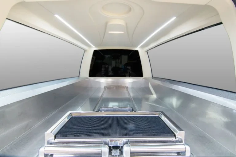 En los coches fúnebres, el espacio destinado a los centros florales es un aspecto clave en el diseño del vehículo, ya que permite el transporte adecuado de arreglos florales junto con el féretro. Este modelo específico ha sido diseñado para optimizar la colocación de los centros florales en la zona de las tumbas, asegurando que haya suficiente espacio para su disposición sin interferir con el féretro ni con la manipulación del mismo.