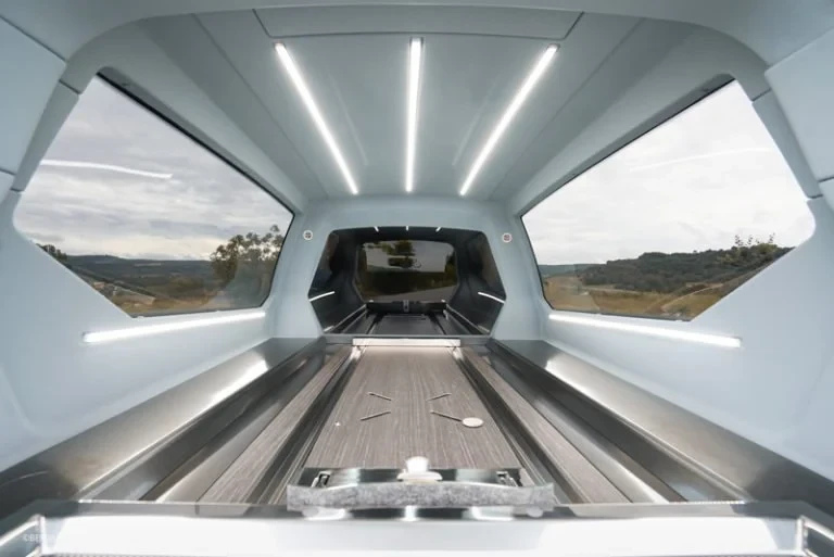El diseño interior del Lumen es minimalista y elegante a la vez. Todas sus líneas conducen hacia la misma dirección: el féretro, el principal protagonista de cualquier ceremonia.