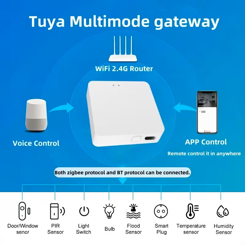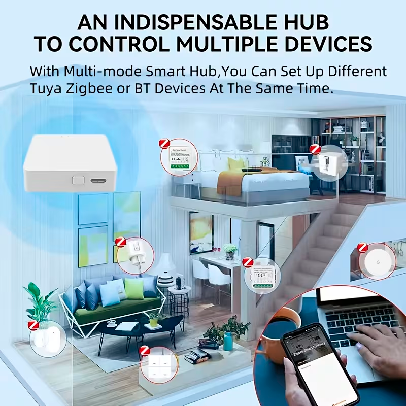 El gateway multimodo Tuya ZigBee y Bluetooth Mesh es el centro de control ideal para gestionar y conectar todos tus dispositivos inteligentes en un solo sistema. Este hub inteligente actúa como puente entre diferentes dispositivos compatibles con Tuya, permitiendo una comunicación estable y eficiente.