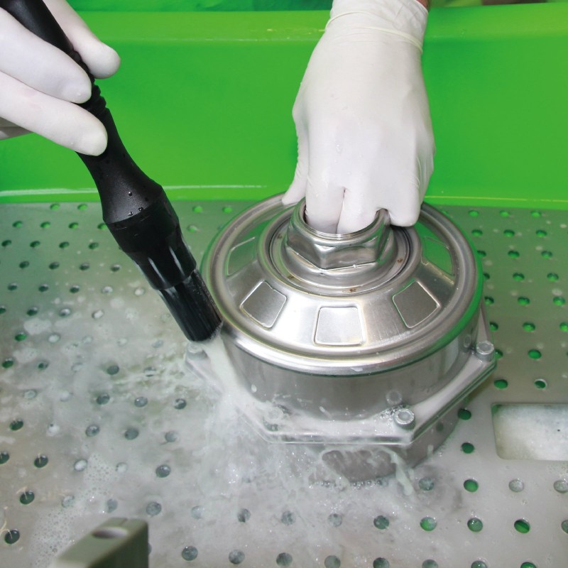 La mesa de lavado de piezas BIO-CIRCLE GT Maxi con superficie de acero inoxidable permite trabajar simultáneamente a dos usuarios en una amplia superficie de trabajo de 1504 x 1004 mm. Con una capacidad de carga de hasta 500 kg, ofrece una comodidad de trabajo óptima, la máxima eficiencia y una tecnología respetuosa con el medio ambiente.