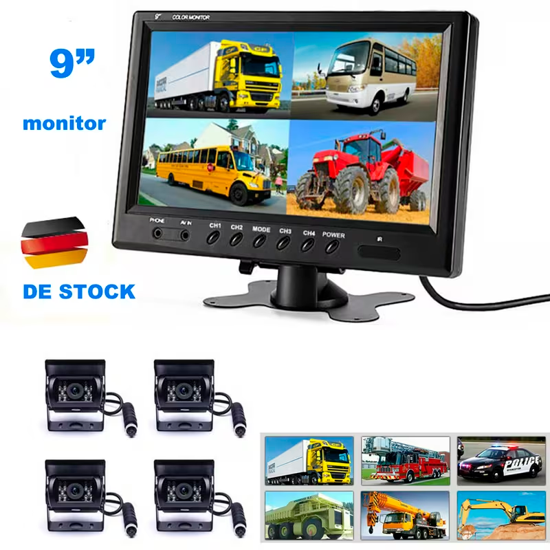 El kit de cámara de marcha atrás PODOFO con monitor de 9 pulgadas (22.86 cm) es una solución profesional diseñada para ofrecer máxima visibilidad y control total en vehículos de gran tamaño. Gracias a su sistema de pantalla dividida en 4 secciones, permite visualizar simultáneamente varias cámaras, mejorando significativamente la seguridad durante la conducción y el estacionamiento.