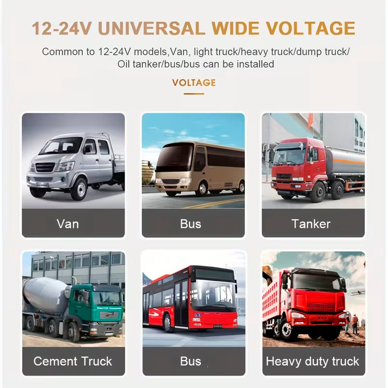 Compatible con vehículos como camiones, remolques, autobuses y furgonetas, este kit funciona con alimentación de 12V a 35V, adaptándose a una amplia gama de usos profesionales.