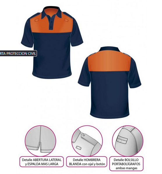 • DOS CANALES o TRABILLAS superiores en tejido de contraste, con cinta de sujección como refuerzo interior, situadas en ambos hombros, para sujetar el micrófono de la emisora ó identificación profesional.