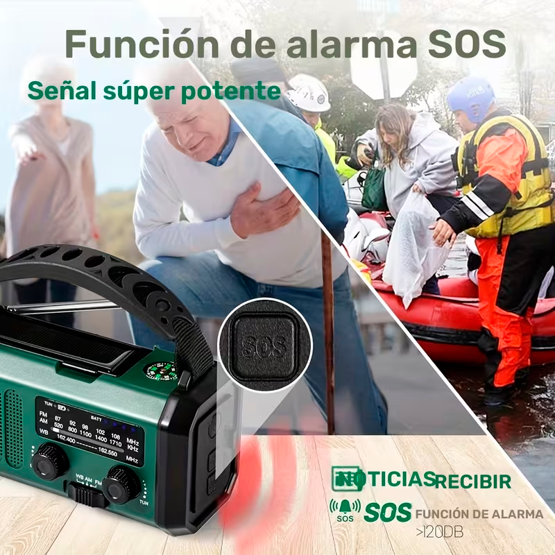 Cuenta con radio NOAA, AM y FM, lo que permite mantenerse informado sobre alertas meteorológicas, noticias y emisiones de emergencia en tiempo real. Esto la convierte en una opción ideal para situaciones de clima extremo, viajes, camping o preparativos de emergencia.