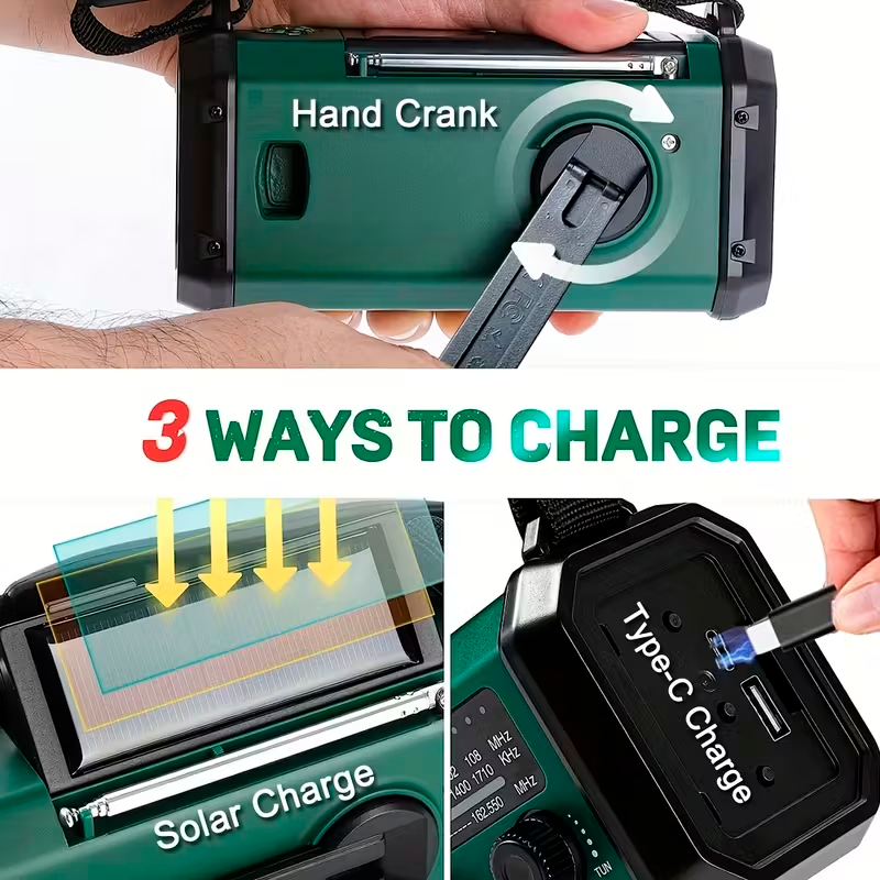 La radio dispone de tres métodos de carga, lo que garantiza que siempre puedas mantener el dispositivo operativo. Puede recargarse mediante energía solar, manivela manual o carga por cable, proporcionando una solución confiable incluso cuando no hay acceso a electricidad.