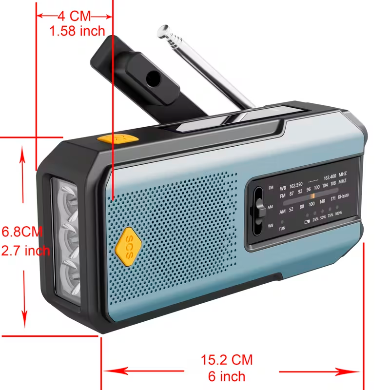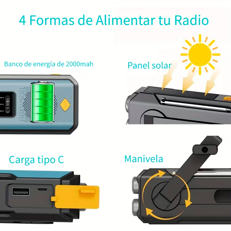 Gracias a su diseño compacto y portátil, esta radio es ideal para camping, senderismo, kits de emergencia, viajes o uso doméstico durante apagones, ofreciendo una solución práctica para mantenerse informado, iluminado y con energía en cualquier situación.